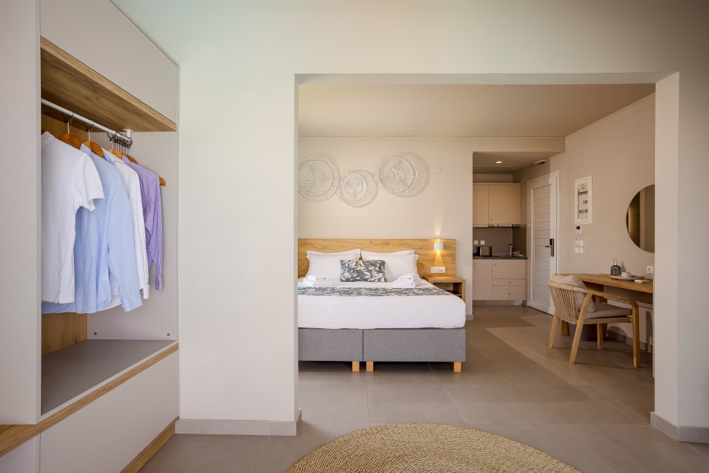 35 square meters interior, premium Sealy mattress, small kitchen, sofa that transforms into semi-double bed.